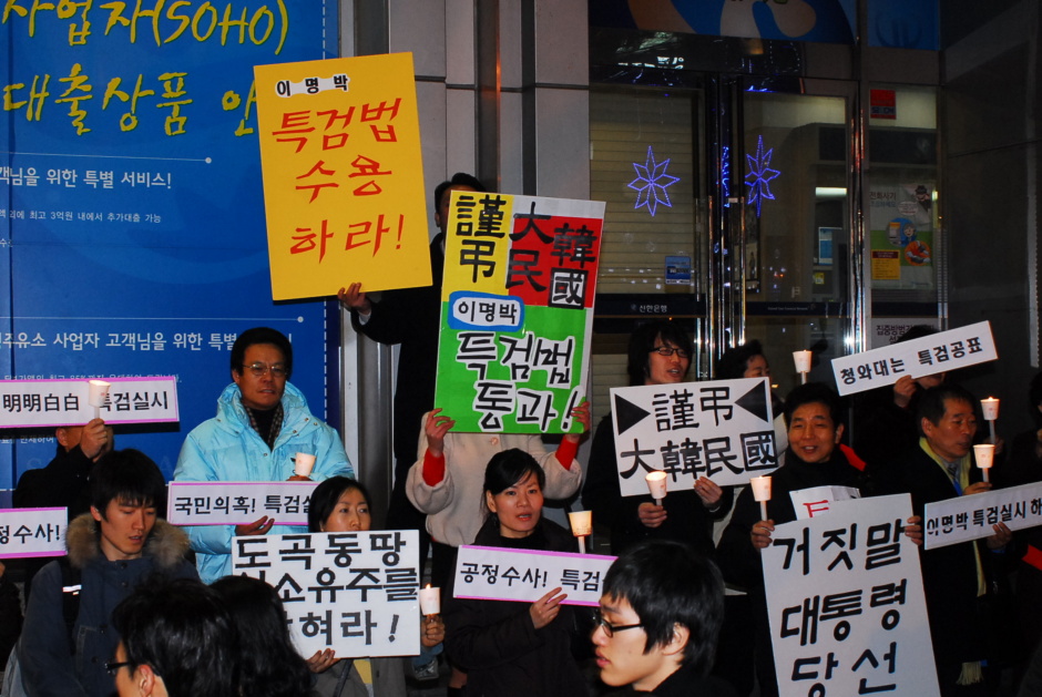 [이명박특검철저수사를위한국민행동] 이라는 단체에서 일 끝나면 나가서 현수막이라도