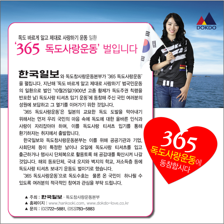 한국일보사는 여기서 한 발짝 더 나아가 ‘독도사랑 티셔츠 입기’ 캠페인을 연중 행사로 진행하고자 합니다. 일본의 도발이 끈질기고 교묘한 만큼 1년 내내 독도에 대한 관심을 환기시켜야 한다는 오피니언 리더들의 제언에 힘입어 내린 결정입니다.