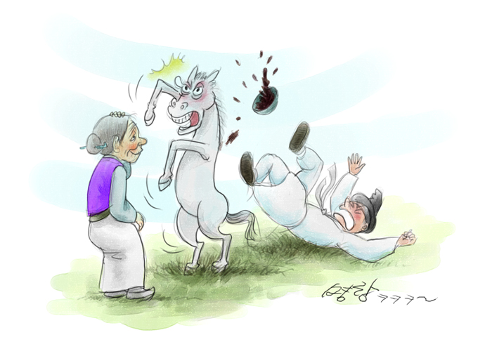 놀란 말이 나뭇군을 밀쳐 떨어졌지 뭡니까.
