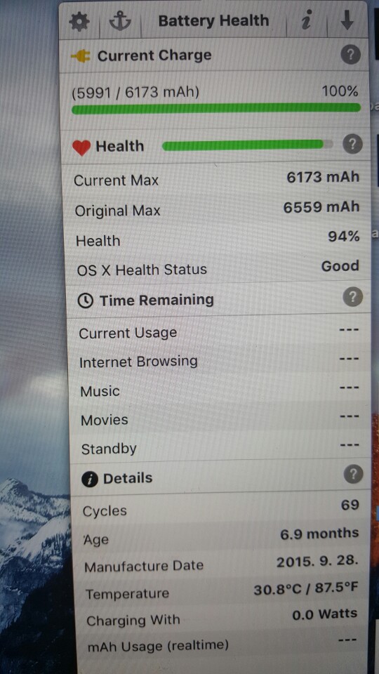 배터리 사이클 69. 맥을 처음써봐서 충전기를 꽂아두고 써야되는지 모르고