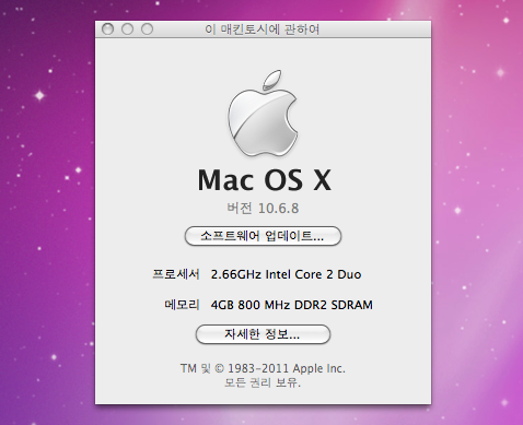 현재 올린 전체화면 사진처럼 스노우레오파드 10.6.8 설치됨