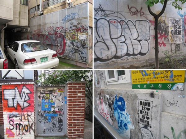동네 강아지들이 자기 영역을 표시하듯 정말 홍대 전역에 이런 표식이 되어 있다.