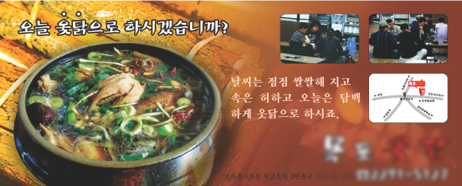 디자인이 좀 재미가 없지않나십네요... 카피두... 점더 어필을 하심어쩔까요.. 내입맛을 사로잡은 XX옺닭~~~... 이것이 진정한 옺닭의 맛!~~~..등등등... 그리고...로고를 맨위로 약도를 맨아래로.. 배치하시는게 나을거 같다는 제 생각이랍니다... ^^*