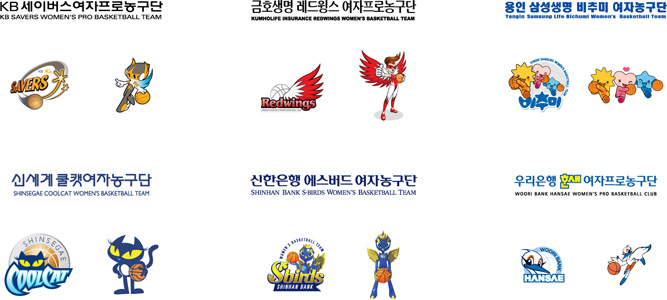 WKBL 각 구단 로고, 엠블럼, 마스코트 glass 일반 3 10400 2008.03.14 19:42 -0001.11.30 00:00 WKBL.sit (0byte) + 177 [여자프로농구단] KB 세이버스, 금호생명 레드윙스, 용인 삼성생명 비추미, 신세계 쿨캣, 신한은행 에스버드, 우리은행 한새